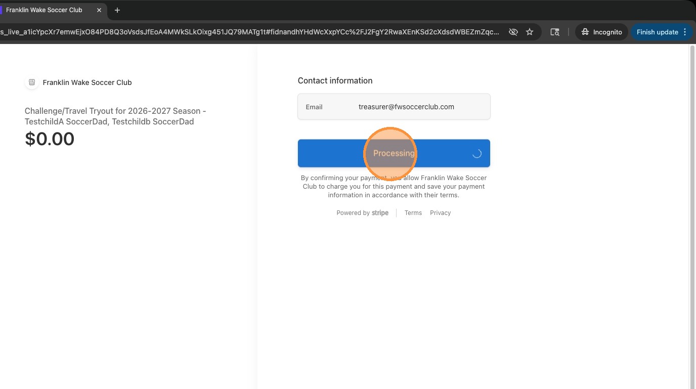 10. Select you're payment options for each player (For Tryout, this is Free) and then choose Register.